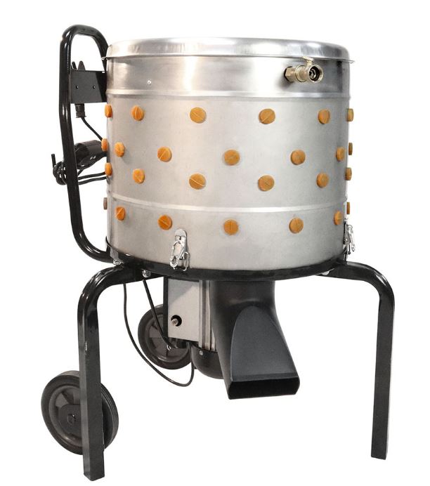 It features a an easy to clean 403 stainless steel tub with 98 rubber fingers that will quickly and easily process 2 – 4 birds at a time (total weight of birds to be plucked at one time should not exceed 16 lbs.), along with an angled chute to discharge feathers away from the motor to prolong its life. There is also an integrated water system with on/off valves to free up hands and conserve water (hose not included).